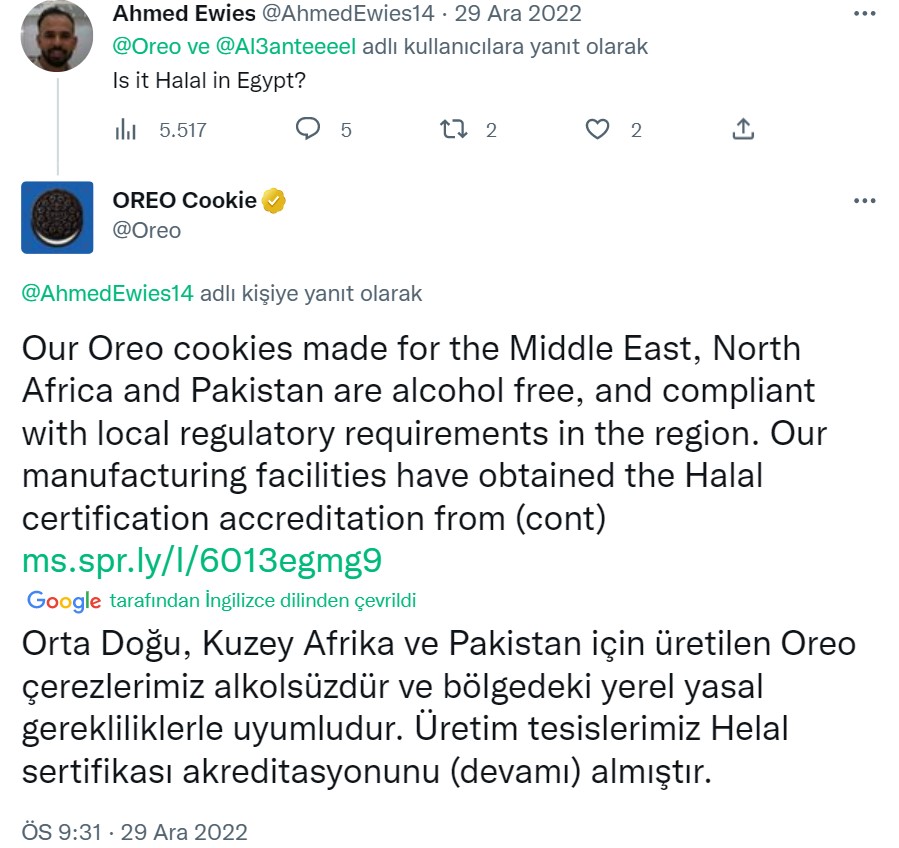 Oreo’nun resmi Twitter hesabı, geçtiğimiz günlerde Mısır’daki Oreo’ların helal olup olmadığı sorulduğunda Orta Doğu, Kuzey Afrika ve Pakistan için üretilenlerin yerel yasal gerekliliklere uyumlu olduğunu açıklamış. Üretim tesislerinin helal sertifikası akreditasyonunu aldığını belirtmiş.
