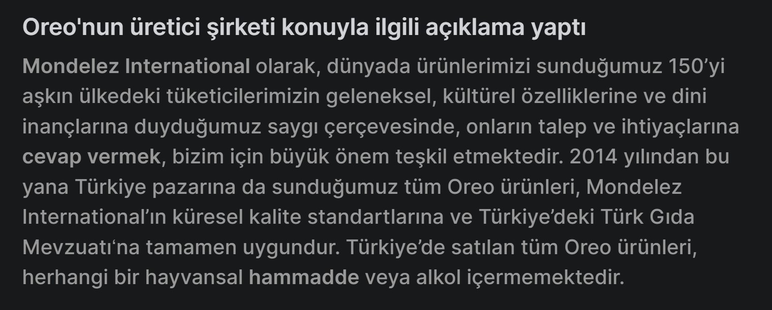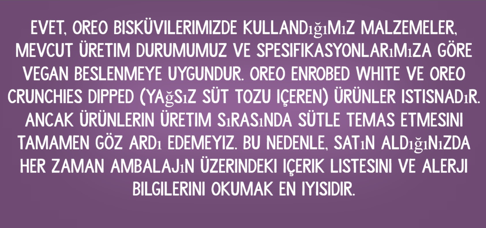 - Üretici firma Mondelez International, Türkiye’de satılan Oreo ürünlerinin herhangi bir hayvansal madde veya alkol içermediğini açıkladı.