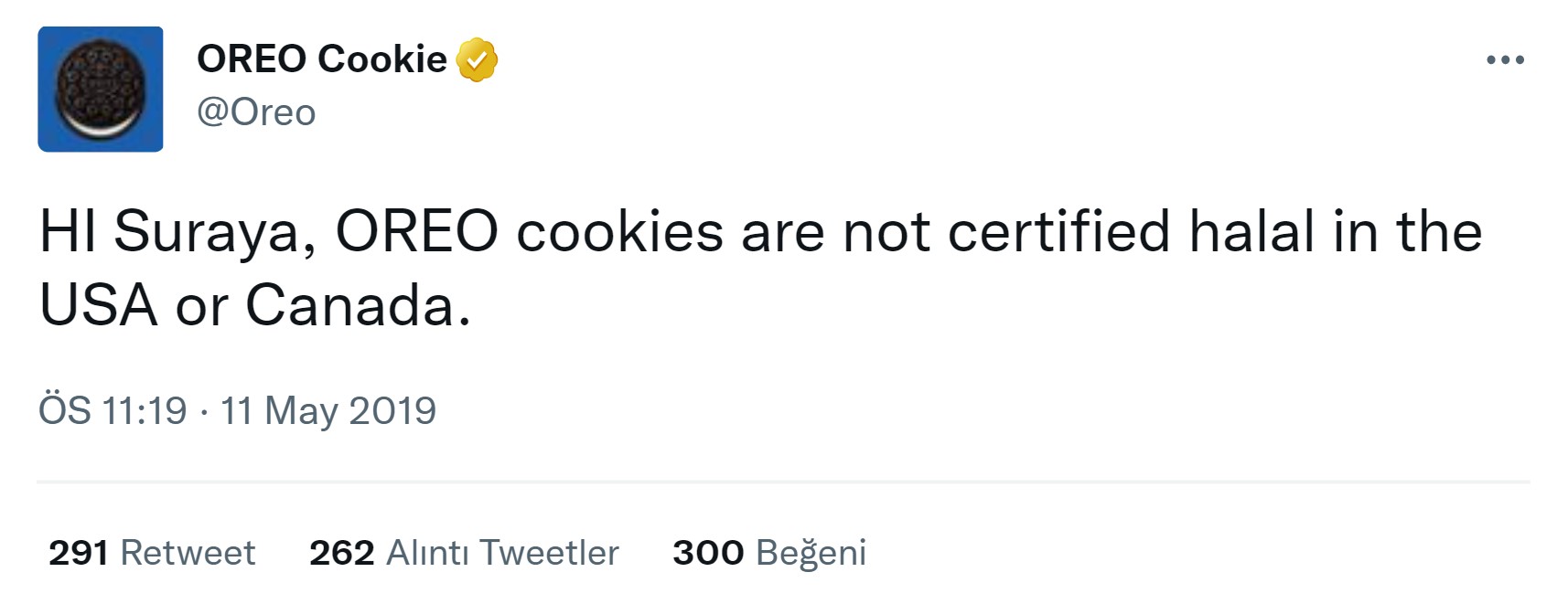 İddia, bir Twitter kullanıcı ile Oreo’nun resmi hesabı arasında 2019 yılında geçen diyaloga dayanıyor. Twitter kullanıcısı, Oreo’ya ürünlerinin helal olup olmadığını soruyor. Oreo da helal olmadığı yönünde bir yanıt veriyor. Bu da insanların kafasının karışmasına neden oluyor.