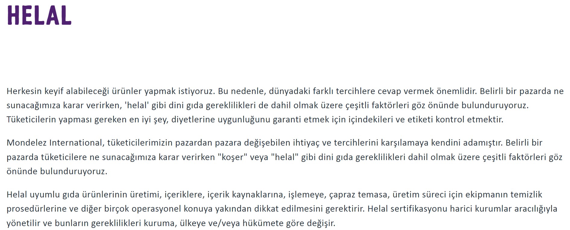 Oreo’nun üretici firması Mondelez’in web sitesinde helal sertifikasyonunun harici kurumlar aracılığıyla yönetildiğini ve bunların gerekliliklerinin kuruma, ülkeye ve/veya hükümete göre değiştiği bilgisi yer alıyor.