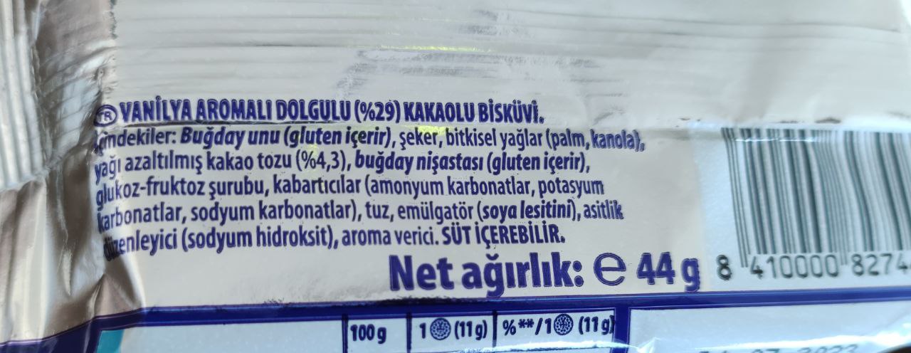 “Buğday unu (gluten içerir), şeker, bitkisel yağlar (palm, kanola), yağı azaltılmış kakao tozu (%4,3), buğday nişastası (gluten içerir), glukoz-fruktoz şurubu, kabartcılar (amonyum karbonatlar, potasyum karbonatlar, sodyum karbonatlar), tuz, emülgatör (soya lesitini), asitlik düzenleyici (sodyum hidroksit), aroma verici. Süt içerebilir.”