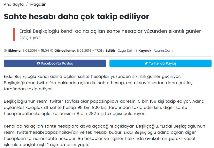 2014 yılında yayımlanan haberin detaylarında sanatçının adına açılan sahte hesabın kendi resmi hesabından daha fazla takip edildiği belirtilmiş. Aynı şekilde 2014 yılında Erdal Beşikçioğlu’nun gözaltına alındığı iddiasıyla gündeme gelen bir olayın da basına yansıdığı anlaşılıyor.