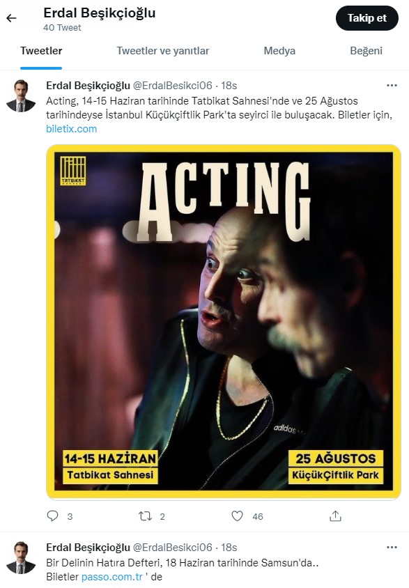 Erdal Beşikçioğlu’na ait olduğu öne sürülen hesabın paylaşımları incelendiğinde, sanatçının tiyatro etkinlik biletleri ve turne programları gibi çeşitli projelerin bilgilendirme afişlerinin paylaşıldığı görülüyor.