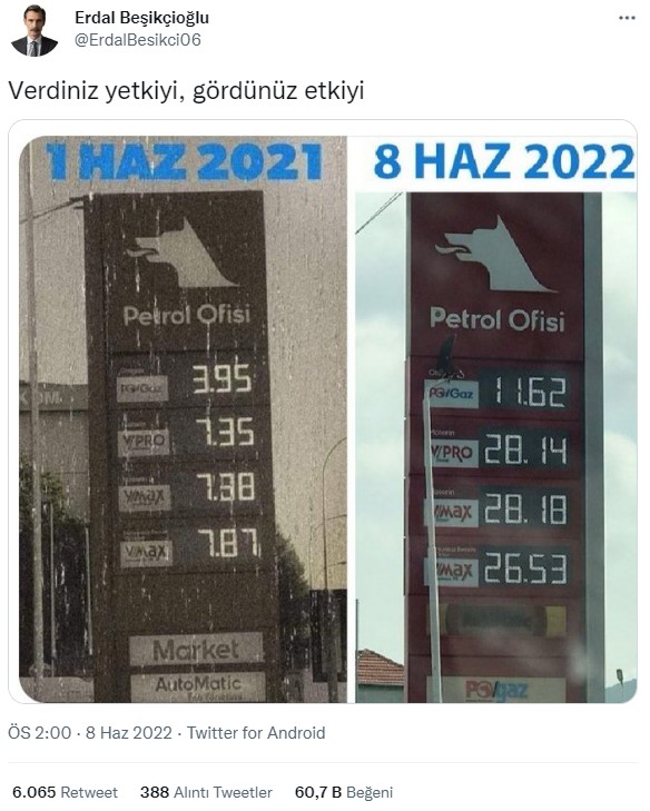 Erdal Beşikçioğlu’nun ismi ve profil fotoğrafının bulunduğu Twitter hesabında, son günlerin gündem konusu olan benzin ve motorine gelen zamları eleştirdiği öne sürülen tweet paylaşımı ortaya çıktı. Mizahi bir eleştiri olarak paylaşıldığı düşünülen tweette, “Verdiniz yetkiyi, gördünüz etkiyi” ifadeleri yer alıyor.