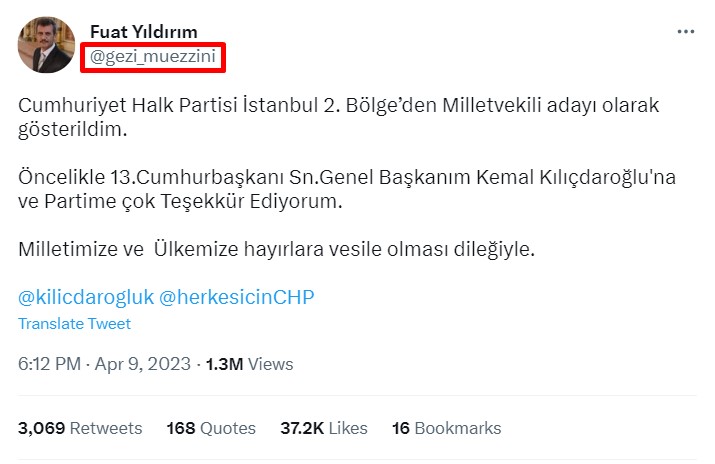 Gezi Parkı eylemleri esnasında Cumhurbaşkanı Recep Tayyip Erdoğan’ın ‘camide içki içildi’ iddiasını yalanlayan eski müezzin Fuat Yıldırım’ın Cumhuriyet Halk Partisi’nden milletvekili adayı olacağı da bir süredir konuşuluyordu. Aday listelerinin teslim edilmesi üzerine Fuat Yıldırım’ın ismi ve görüntüsünü kullanan bir Twitter hesabından adaylık duyurusu yapıldı. Söz konusu tweet binlerce beğeni alırken hesap da çok sayıda takipçi kazandı.