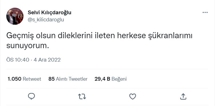 “Geçmiş olsun dileklerini ileten herkese şükranlarımı sunuyorum.”