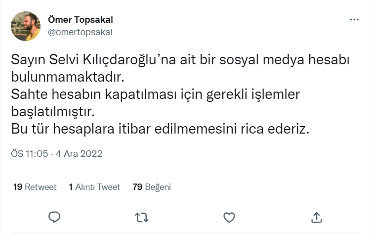 Ayrıca Kemal Kılıçdaroğlu’nun danışmanı Ömer Topsakal da twitter hesabından söz konusu hesabın Selvi Kılıçdaroğlu’na ait olmadığını belirten bir açıklama paylaştı.