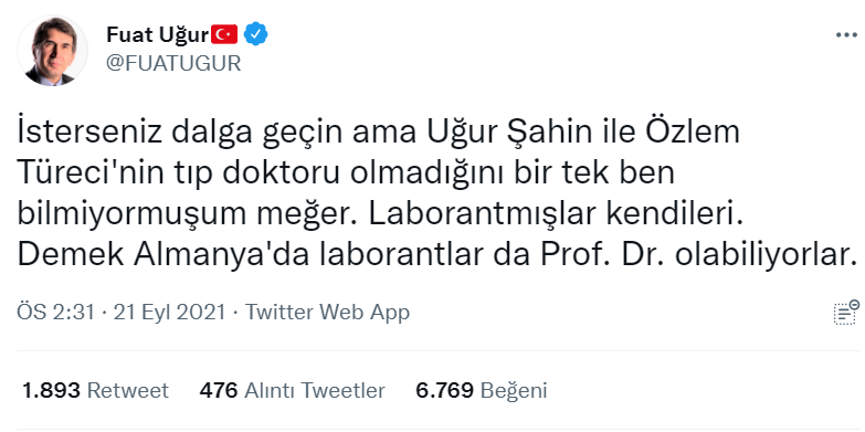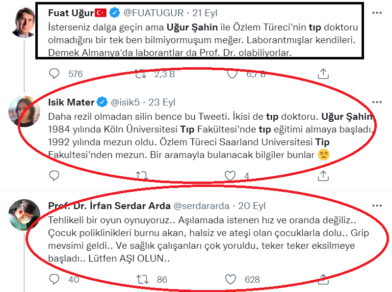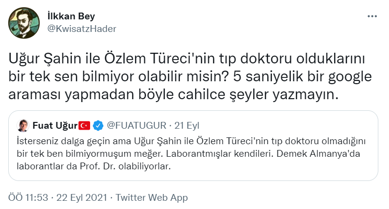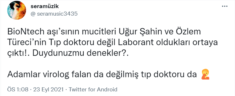 Twitter’da 21.09.2021’de gündeme gelen Uğur Şahin ve Özlem Türeci’nin tıp doktoru olmadığı iddiası şaşkınlık uyandırdı. Öncelikle Türkiye Gazetesi yazarı Fuat Uğur tarafından gündeme getirilen iddiayı birçok sosyal medya kullanıcısı da paylaştı. Söz konusu iddia yorumlarla desteklendi. Durum böyle olunca iddia hakkında şüpheler iyiden iyiye arttı. Dolayısıyla Şahin çiftinin ürettikleri covid-19 aşısının güvenilirliğine dair şüpheler de arttı.