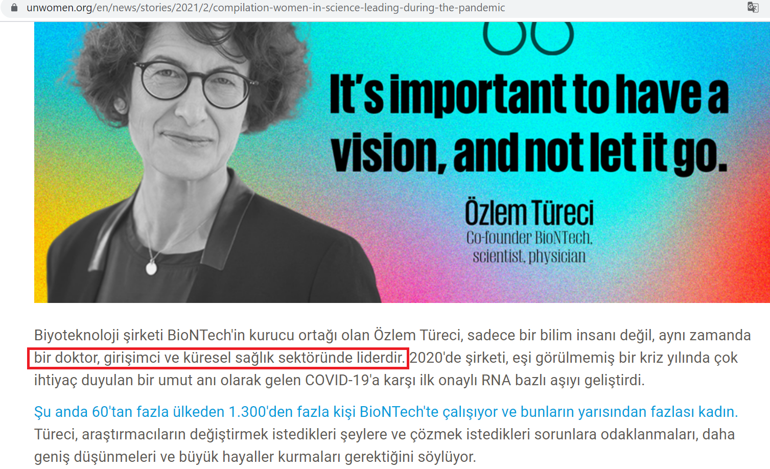 UN WOMAN (Birleşmiş Milletler Cinsiyet Eşitliği ve Kadınların Güçlendirilmesi Kurumu), yayımladığı bir yazıda Özlem Türeci’den bahsederek onun yalnızca bir bilim insanı değil, aynı zamanda bir tıp doktoru, girişimci ve yönetici olduğunu belirtti.