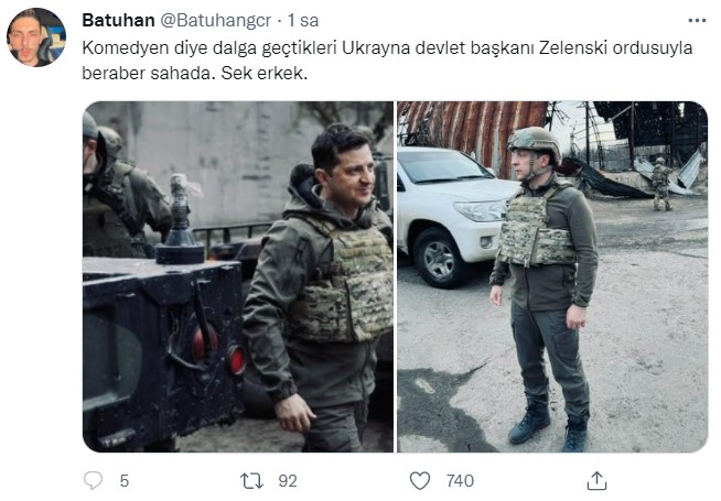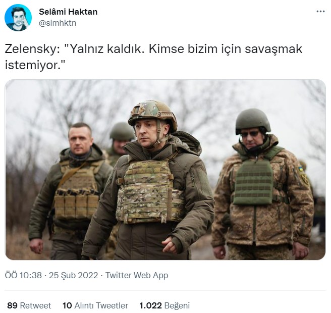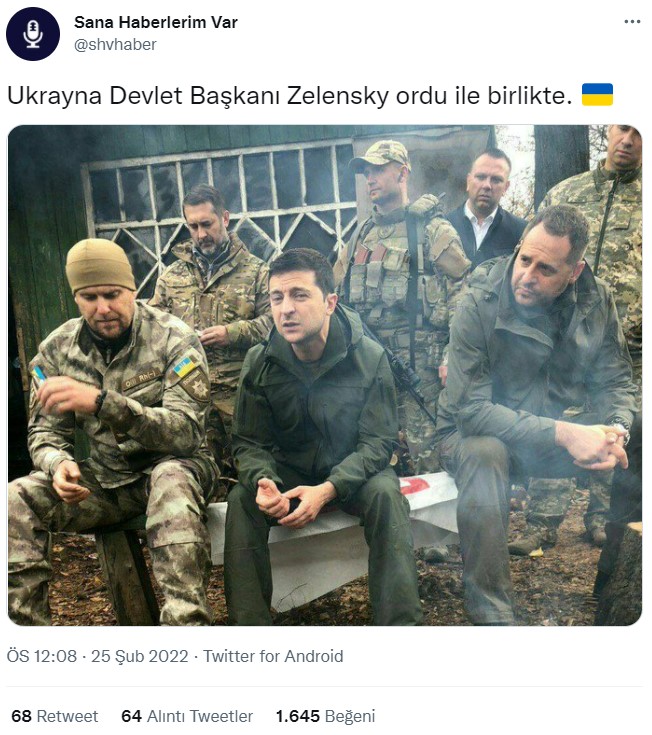 Bu son dakika gelişmeleri ile ilgili Twitter’da Ukrayna Devlet Başkanı Volodimir Zelenski’nin fotoğraflarını kapsayan bir iddia öne sürüldü. İddiada Ukrayna Devlet Başkanının, orduyla birlikte sahada olduğu belirtilirken; başkanın askeri üniformalı olduğu bir dizi fotoğraf da söz konusu iddiaya kaynak olarak gösterildi.