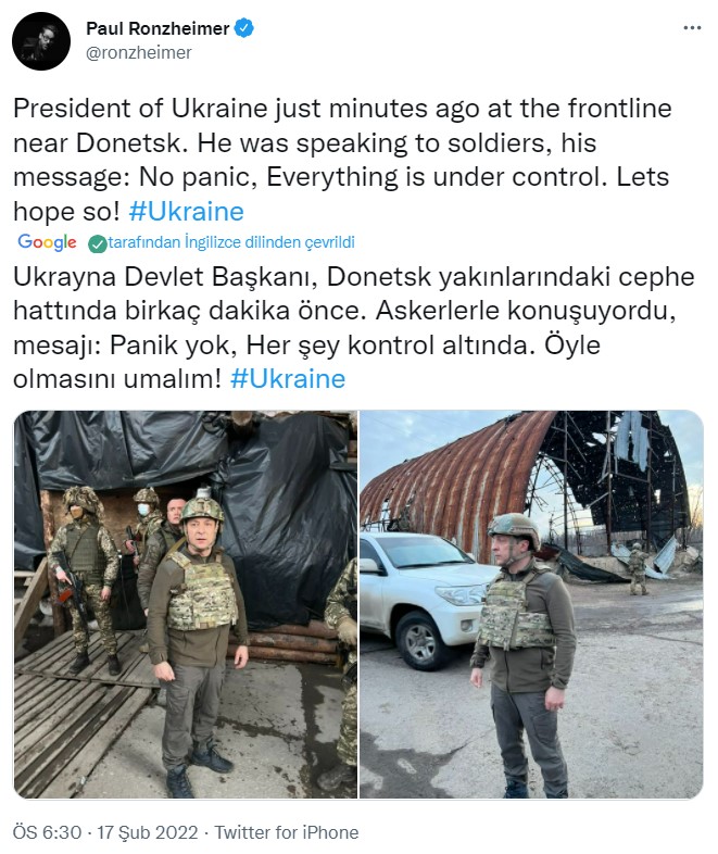 Kullanıcıların konuyla alakalı bir diğer paylaşımında Zelenski’nin bir aracın önünde beklediği anın fotoğrafı görülmekte. Bu fotoğrafı da yine aynı arama yöntemi kullanarak araştırdığımızda Paul Ronzheimer’ın ilgili tweetine ulaştık. Sonuç olarak bu fotoğrafın nispeten yeni olduğunu fakat 17 Şubat 2022’de paylaşıldığını tespit ettik. Paylaşımın yapıldığı zamanlarda Rusya – Ukrayna askeri operasyonları henüz başlamamıştı.
