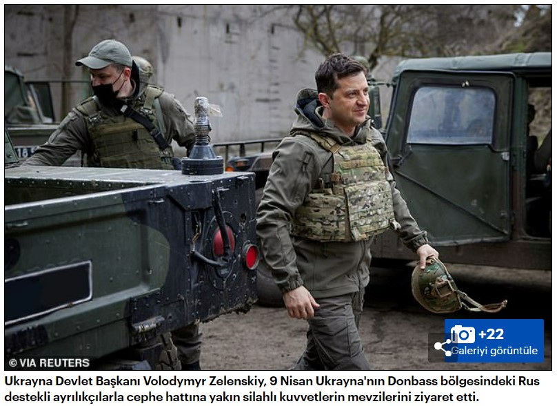 “Ukrayna’nın doğu sınırına Putin’in yerleştirdiği 80 bin Rus askerine karşı, Ukrayna Başkanı kendi birliklerini ziyaret edip cesaretlendirdi.” açıklamasıyla paylaşılan Dailymail haberinde başkanın askeri üniformalı fotoğrafları görülüyor.