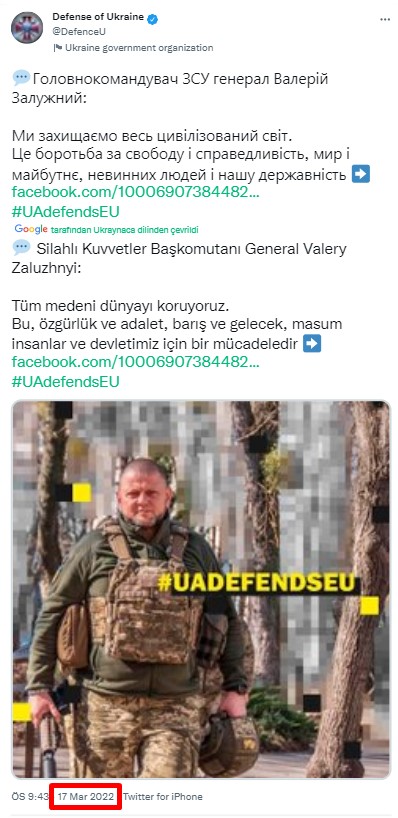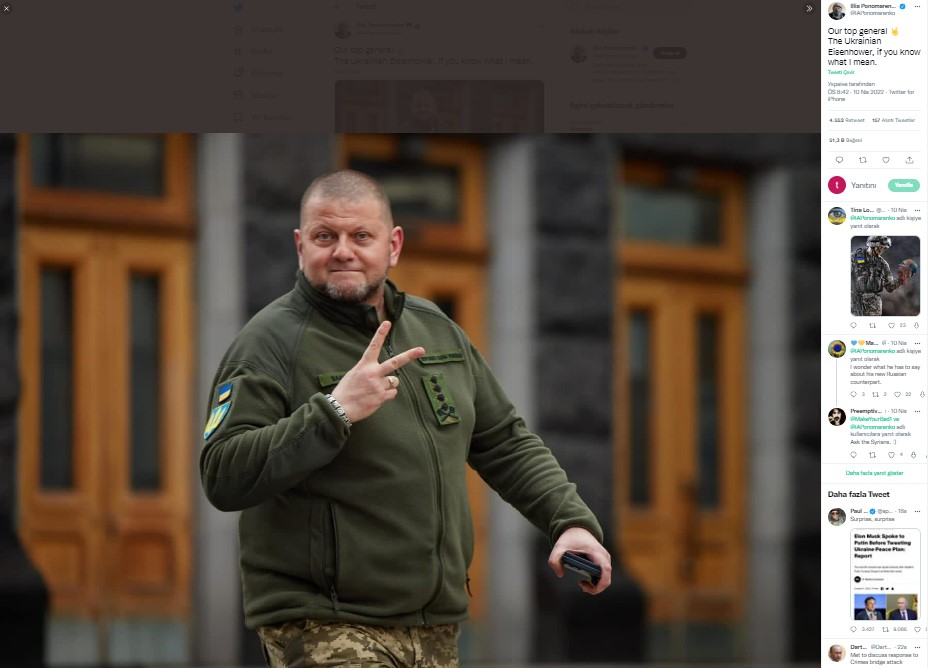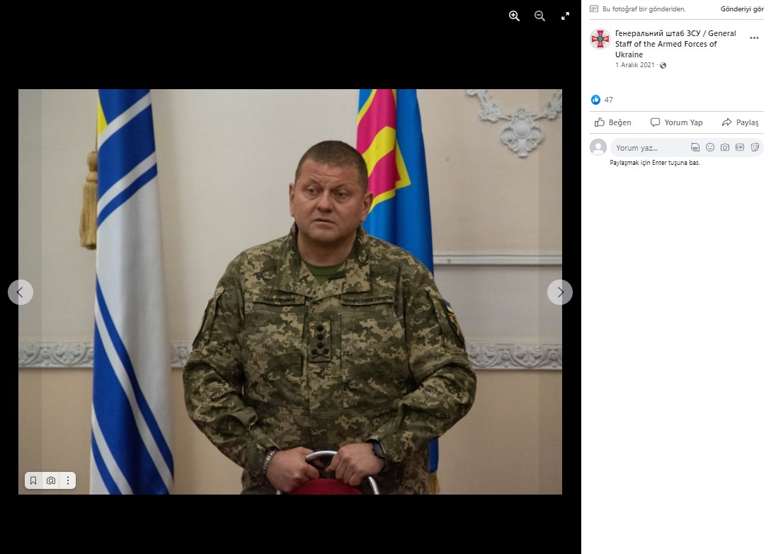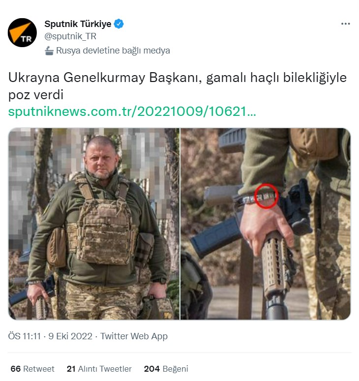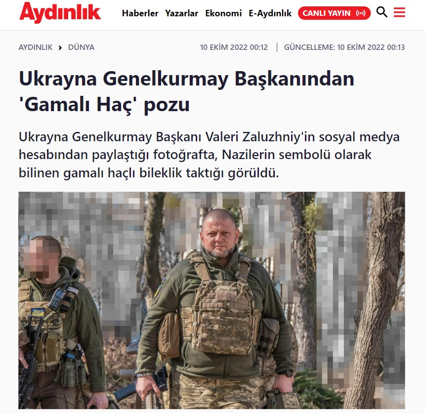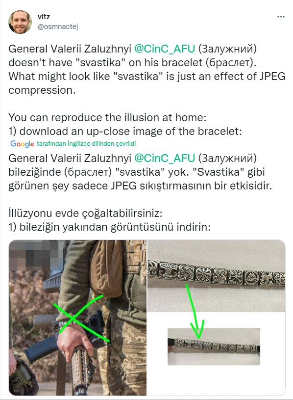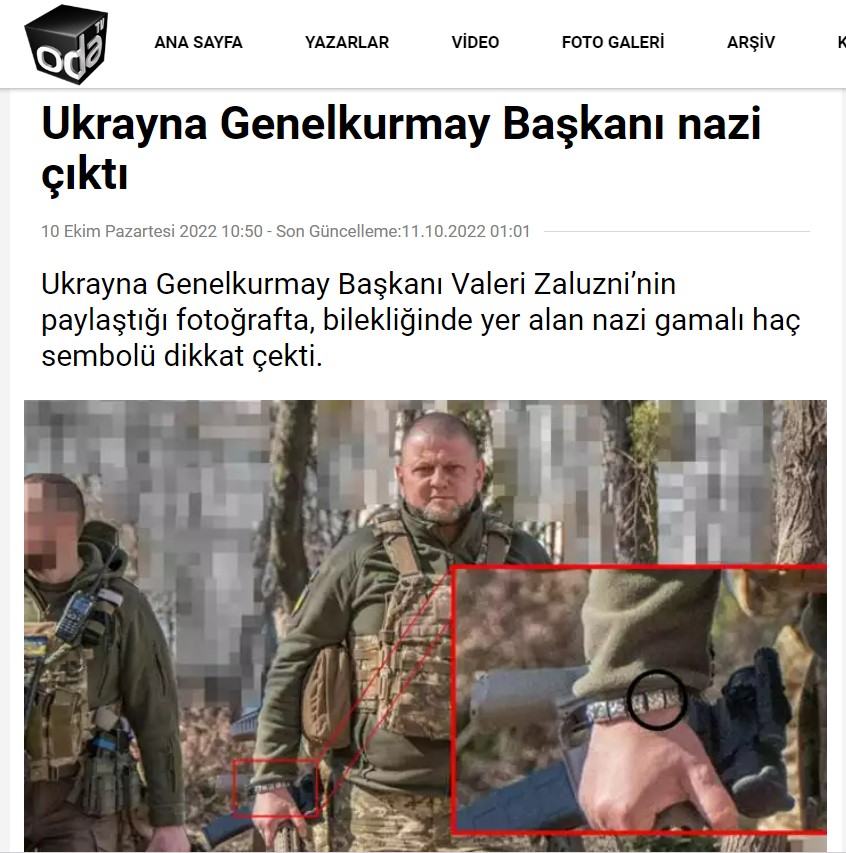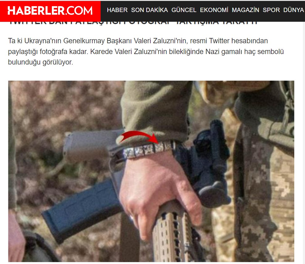 Ukrayna Genelkurmay Başkanı Valeri Zaluzni, 6 Ekim’de Twitter hesabından kendi fotoğrafını eklediği bir gönderi paylaştı. Bu paylaşımın ardından birçok Twitter kullanıcısı, Zaluzni’nin bilekliğinde gamalı haç olduğu yorumunu yaptı. Gamalı haç, Nazi’leri simgelediği için genelkurmay başkanının da bu anlayışta olduğu iddiası yayılmaya başladı.