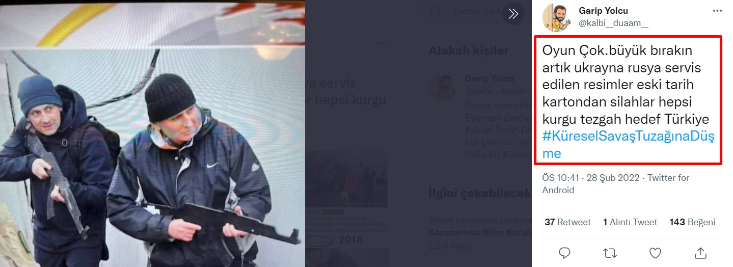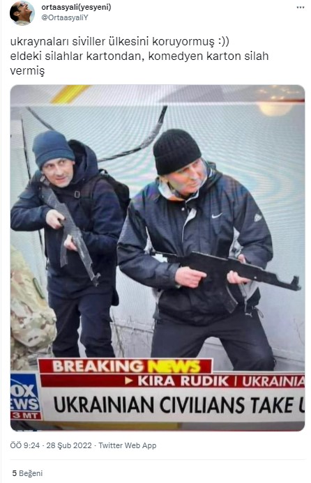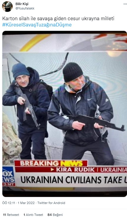 26 Şubat 2022’de Fox News’te yayımlanan haberin ekran görüntüsünü alarak sosyal medyada paylaşım yapan kişiler, ellerinde silah görünümlü iki tahta tutan iki kişiyi kanıt göstererek yaşanılan Ukrayna – Rusya çatışmalarının sahte olduğunu iddia etmişlerdi.