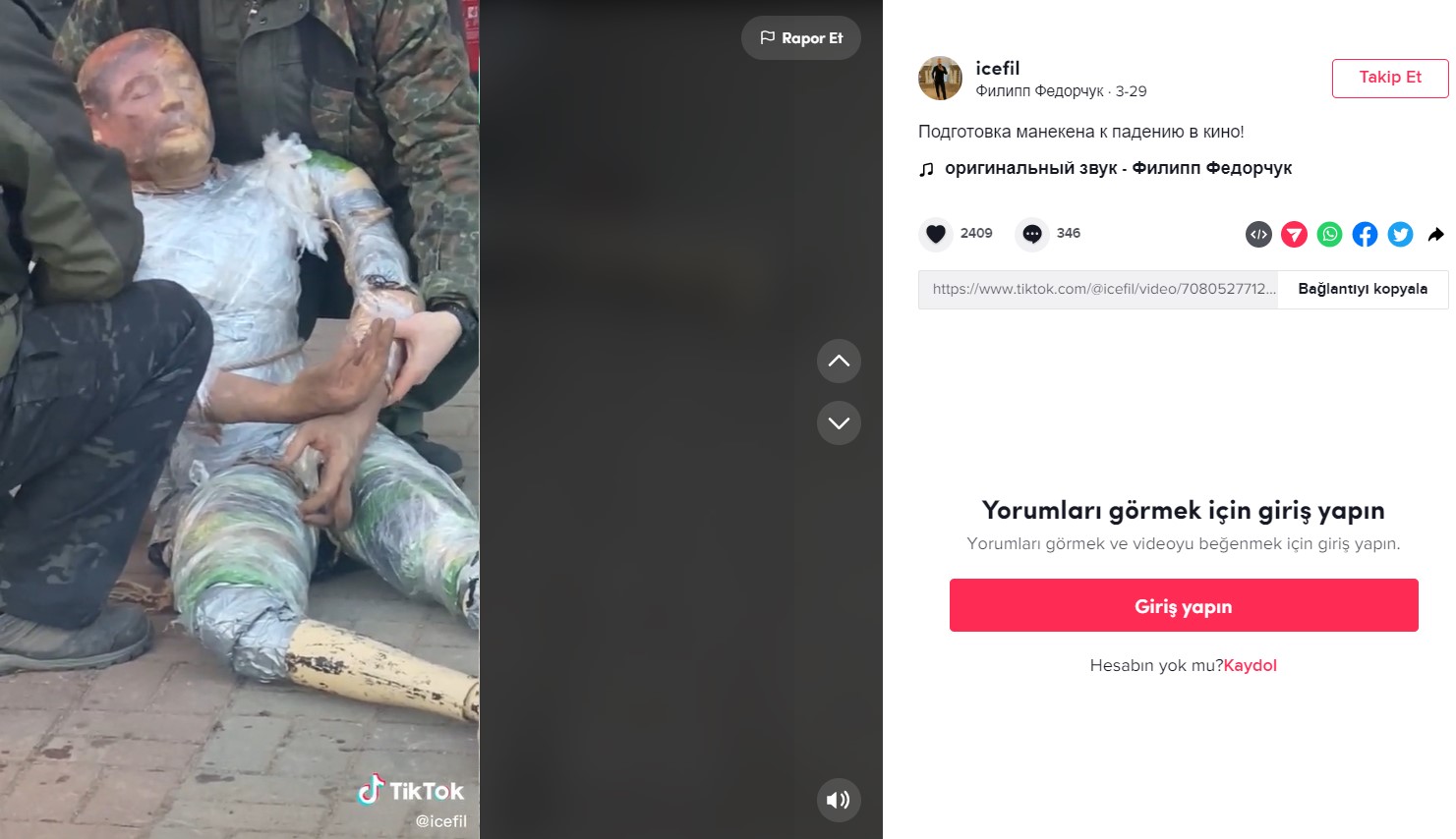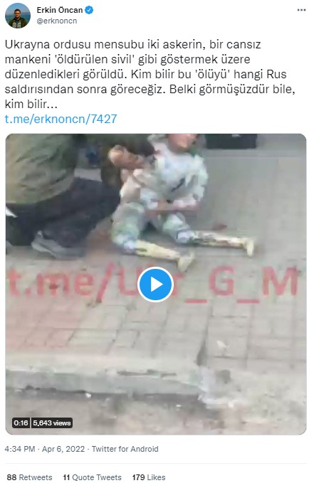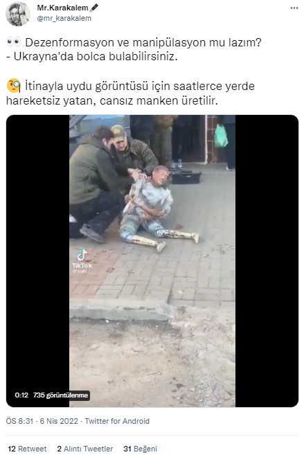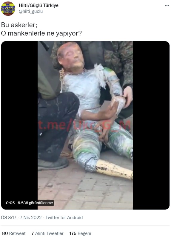 Buça’dan haberler gelmeye devam ederken, twitter’da son günlerde çok sayıda hesap tarafından paylaşıldığını gördüğümüz bir iddiayla karşılaştık. Sosyal medya kullanıcılarının paylaşımlarına göre Ukrayna ordusu, cansız bir mankeni ‘öldürülen sivil’ gibi göstererek Rus saldırısının bir sonucu olduğunu düşündürdü.