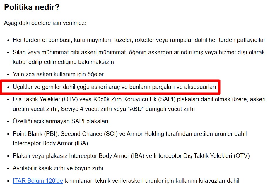 Dünyanın en büyük sıfır, ikinci el satış platformlarından biri olan eBay üzerinde satış poliçesi incelendiğinde, askeri ekipmanlar, arazi araçları ve patlayıcıların ürün olarak listelenmesinin yasak olduğu yasalar çerçevesinde belirtiliyor. Dolayısıyla böyle bir ilanın teknik olarak eBay tarafından kabul edilmesi de mümkün değil.
