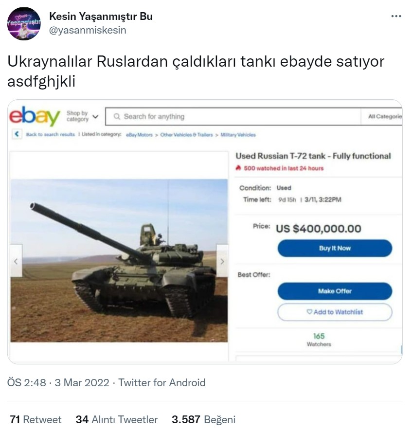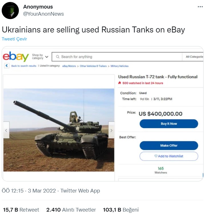 Bu iddialardan birisi de, Ukraynalıların terk edilmiş Rus tankları için, bir online alım satım sitesi olan eBay’de ilan vermesi.