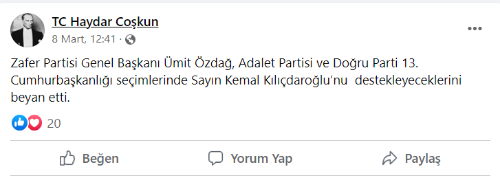 Sosyal medyada Zafer Partisi için bu adaylığa ilişkin destek iddiaları dolaşıma girdi.