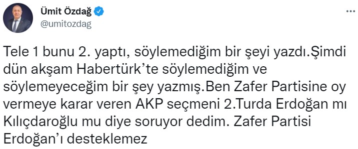 Twitter’da Ümit Özdağ ile ilgili tweetleri incelerken Özdağ’ın bizzat kendi tweetine rastlıyoruz. Tweet’te Tele 1’in yaptığı haberin ekran görüntüsünü ekleyerek sözlerinin çarpıtıldığını, böyle bir ifade kullanmadığını belirtmiş.