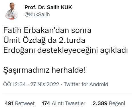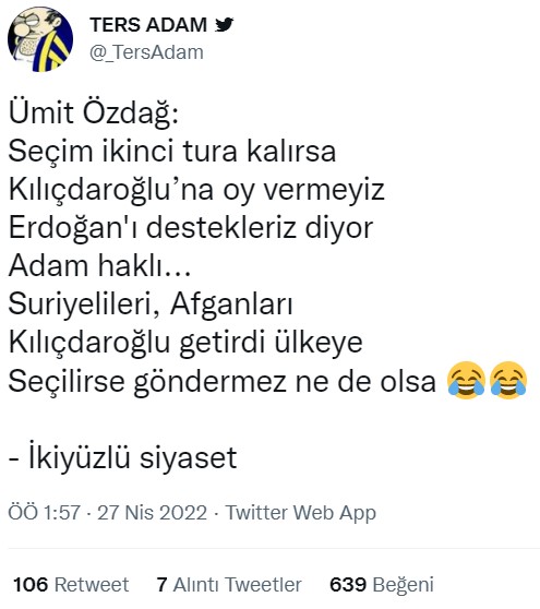 - Ümit Özdağ’ın 26 Nisan 2022 tarihli Habertürk ‘Teke Tek’ canlı yayınında verdiği beyanda, Kılıçdaroğlu değil, Erdoğan’ı destekleyeceğine dair net bir söylem yok. Özdağ, Kılıçdaroğlu’nun aday olmaması gerekliliğini söylemiş.