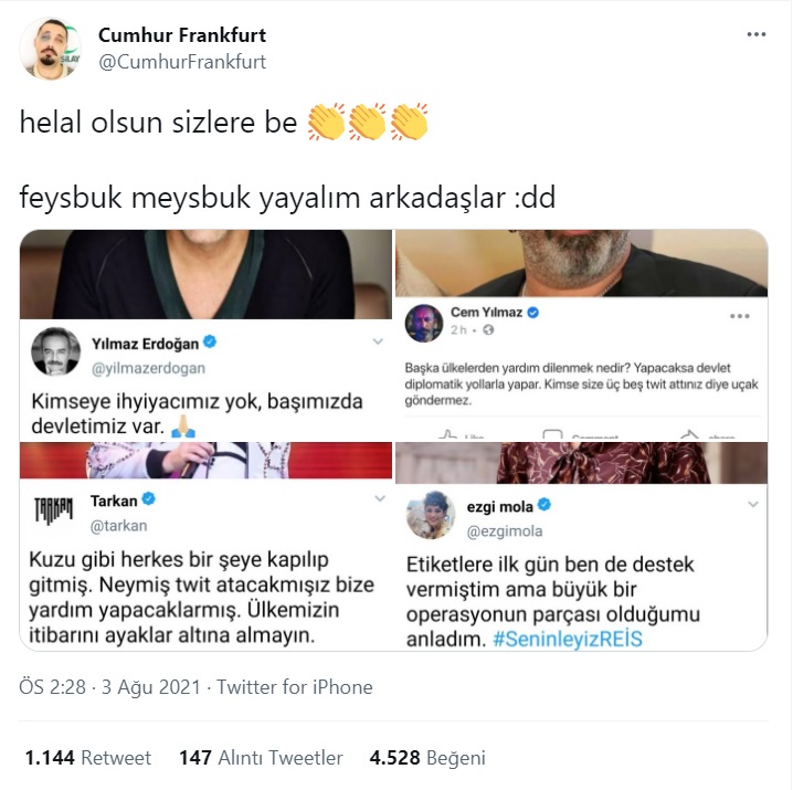 Twitter’da Cumhur Frankfurt isimli hesap tarafından ünlülerin tweetlerine ait olduğu iddia edilen ekran görüntülerini paylaştı. Hesabın geçmiş paylaşımlarına bakıldığında, söz konusu paylaşımı hiciv ve mizah amacıyla yaptığı anlaşılıyor. Ancak, tweet görsellerini gerçek olarak algılayan bir çok sosyal medya kullanıcısına rastladık.