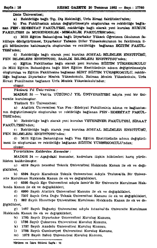 Bu amaçla, 1981 yılında oluşturulan bir heyet Ankara’ya gitmiş, Devlet Başkanı Sayın Kenan EVREN tarafından kabul edilen dernek üyelerine, Van’da bir üniversite kurulacağı müjdesi verilmiştir. 6 Kasım 1981 tarihinde üniversitelerimize yeni bir düzen getiren 2547 sayılı Yükseköğretim Kanunu’nun çıkarılmasından yaklaşık 8,5 ay sonra 20 Temmuz 1982 tarihinde, 41 sayılı Yükseköğretim Kurumları Teşkilatı hakkında kanun hükmünde kararname çıkarıldı. Bu kararname ile yeni üniversiteler açıldı. Bunların arasında Van Yüzüncü Yıl Üniversitesi de vardı.”