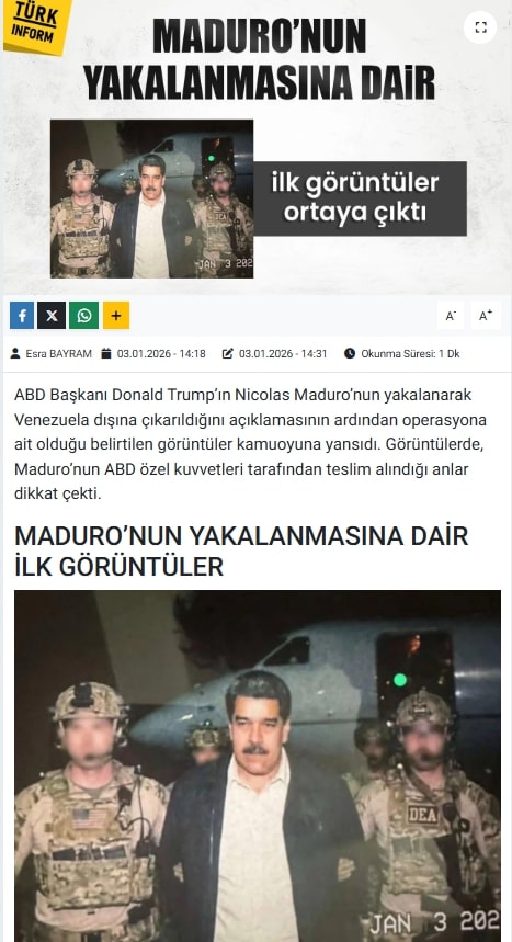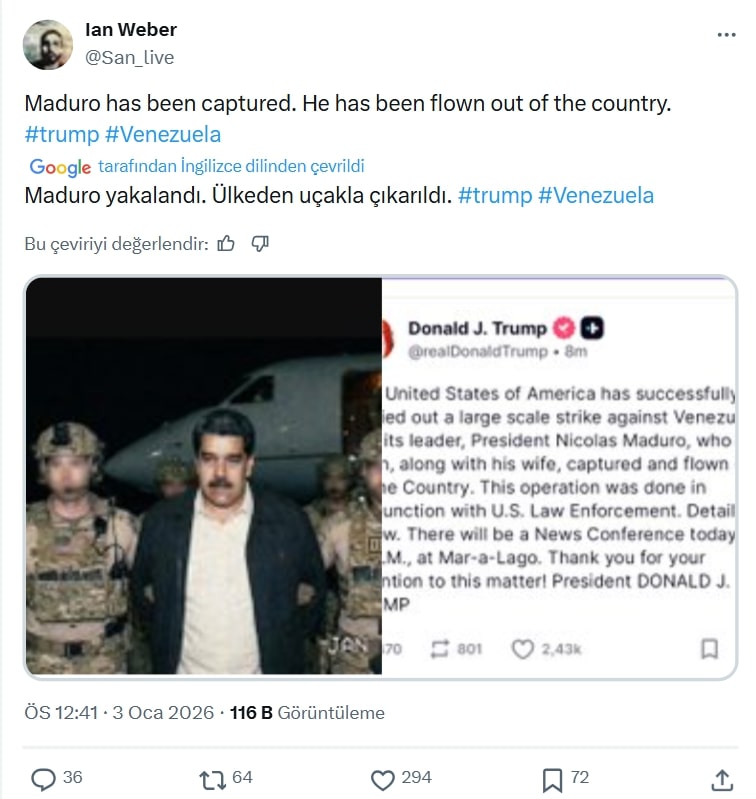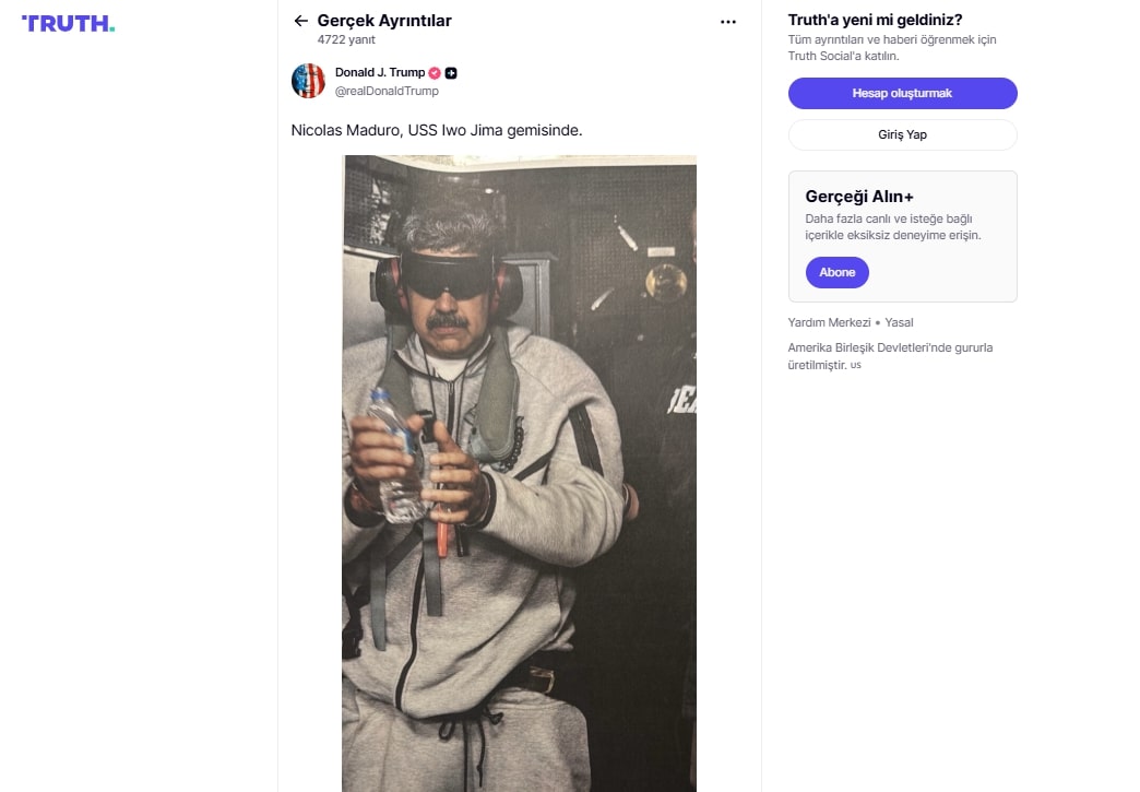 Haberlere göre Maduro’nun yakalanmasına dair ilk görüntülerden biri ABD Başkanı Donald Trump tarafından paylaşıldı.