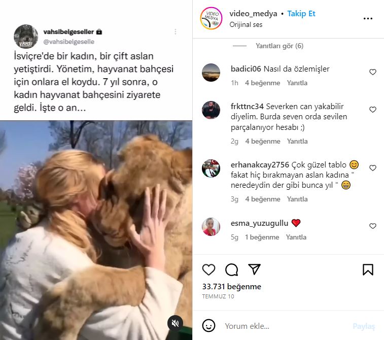 Videonun açıklamasında, “Birileri 2 aslanlı videomuzu çaldığı ve bu konuda tamamen yanlış bilgi verdiği için (aslanlar 7 yaşında, hanım onları sahiplendi ve 7 yıl sonra onları İsviçre veya İspanya’da ziyaret etti…🙈 gibi), bu yenisini filigranlarla yaptık… Teşekkürler.” ifadeleri yer alıyor.