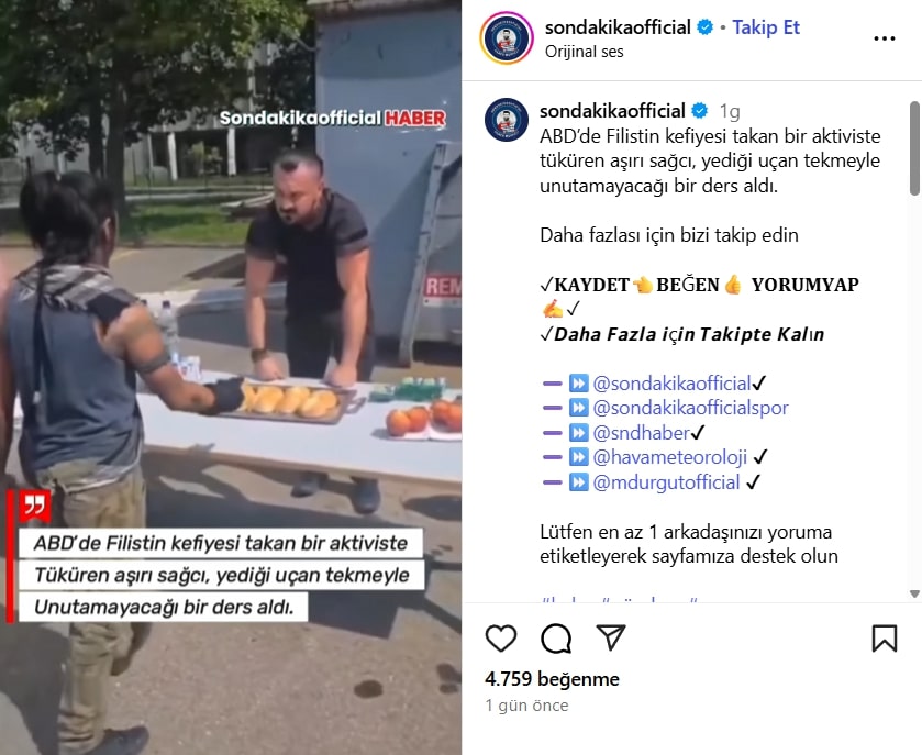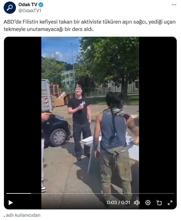 Sosyal medyada hızla yayılan bir videoda, ABD’de Filistin kefiyesi takan bir aktiviste tüküren aşırı sağcıya uçan tekme atıldığı öne sürülüyor. Görüntülerin farklı platformlarda paylaşılıp milyonlarca izlenmesi, iddianın kısa sürede gündem olmasına yol açtı. Birçok kullanıcı, videoyu “adalet yerini buldu” veya “hak ettiği cevabı aldı” yorumlarıyla paylaşırken, bazıları ise görüntülerin bağlamından koparıldığını ve farklı bir olaya ait olabileceğini savunuyor.