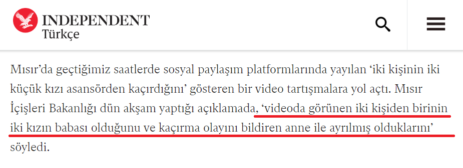 Haber Türkiye’de de gündeme gelmiş, Independent Türkçe “Mısır iki kızın asansörden kaçırılmasını konuşuyor” başlıklı yazısında ülkenin İçişleri Bakanlığının yaptığı açıklamaya yer vermiş. Buna göre videoda görünen iki kişiden biri iki kızın babasıymış. Kahire’nin doğusundaki Nasr şehrinda yaşayan anne, eski eşinin çocuklarından birini onayı olmadan aldığını bildirmiş. Çift, boşandıktan sonra 2022’ye dek babaları ile kalmış ancak daha sonra ikisinin de velayeti anneye verilmiş. Baba bunun üzerine çocuklarını kaçırmak için harekete geçmiş. Kızlardan biri babayla giderken kaçırılmalarına yardım eden iki kişi de tutuklanmış.