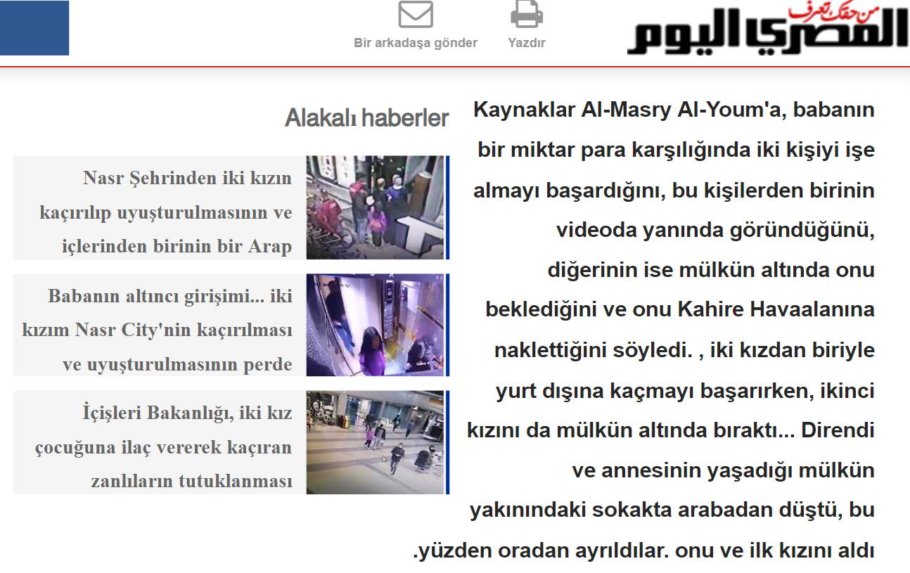 Al Masry Al Youm‘un haberine göre kızlardan biri direnerek kaçırılmaktan kurtulmuş ve annesine teslim edilmiş.