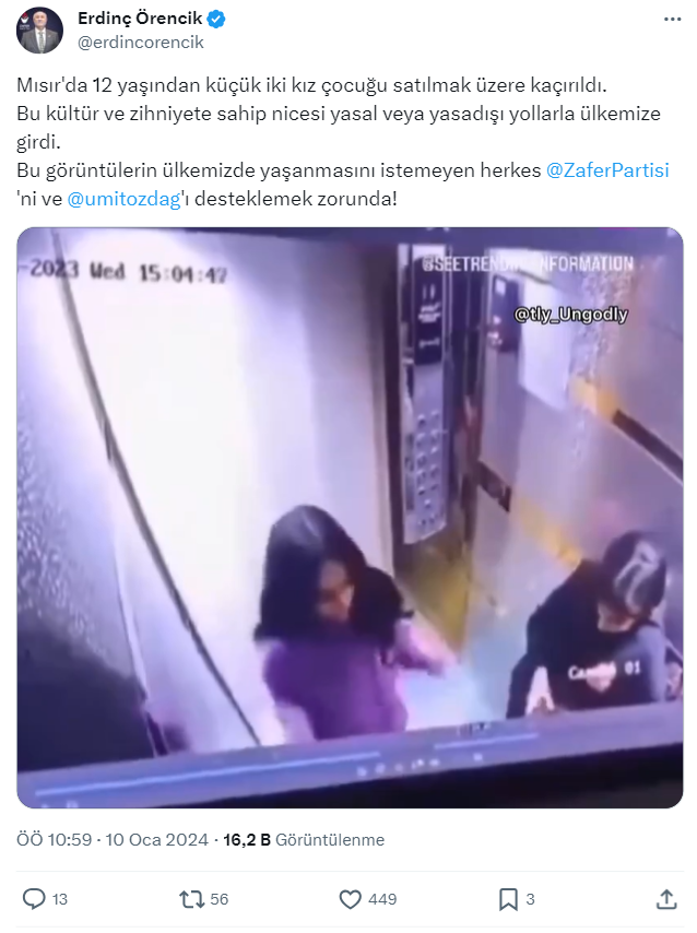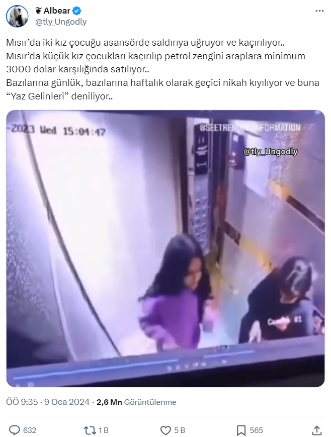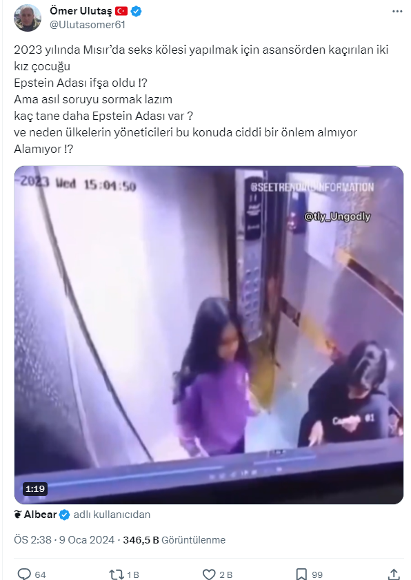 ABD’de kız çocuklarına yönelik cinsel istismar davası Epstein’a dair detaylar kamuoyu ile paylaşılırken sosyal medyada kız çocuklarının istismarına yönelik yeni iddia ve videolar yayılmaya devam ediyor. Gündeme gelen son videoya göre Mısır’da iki kız çocuğu, zenginlere satılmak üzere asansörden kaçırılırken görüntülenmiş.