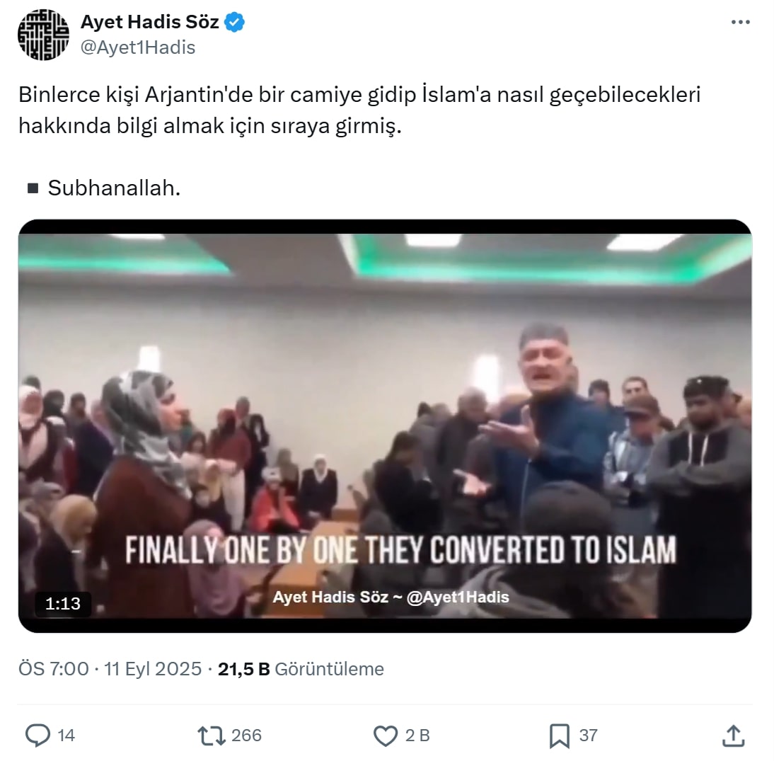 - Video, Arjantin’de toplu İslam’a geçişi gösteriyor iddiasını desteklemiyor; görüntüler farklı ülkelerden ve etkinliklerden alınmış.