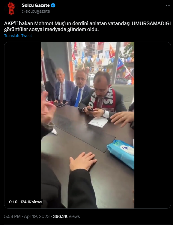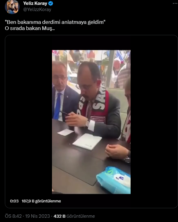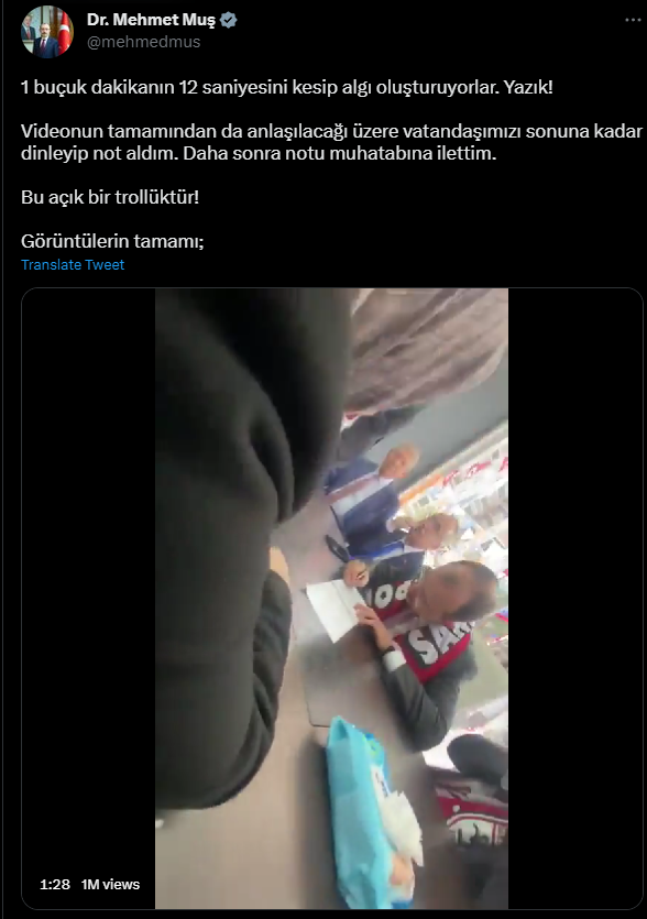 Kırpılan kısımda Bakan Muş telefonuyla ilgilenip vatandaşı dinlemediği iddia ediliyor.