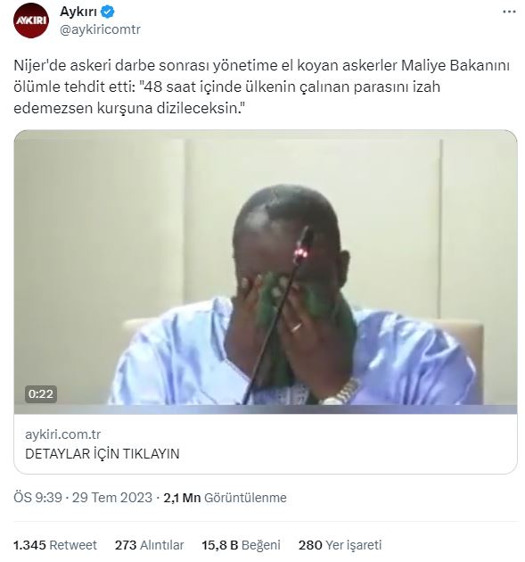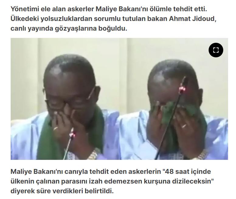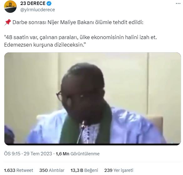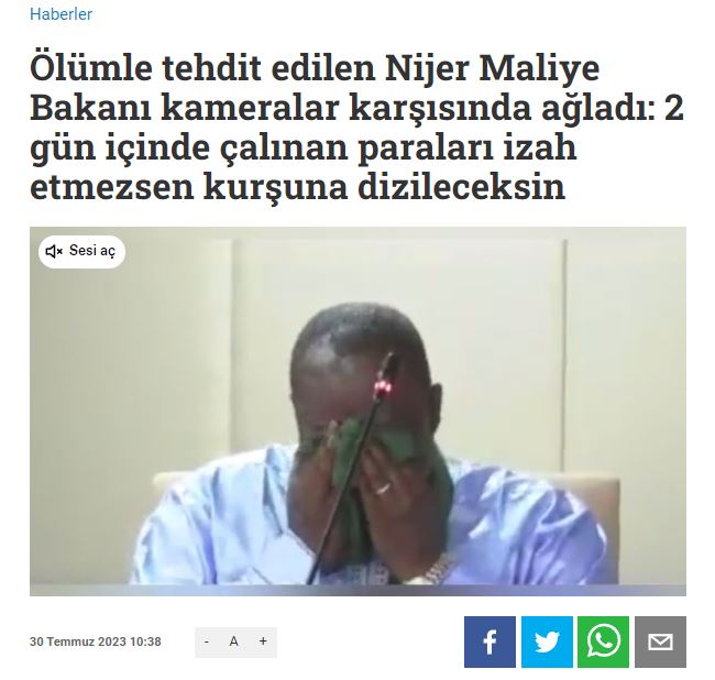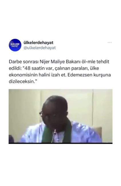 Videonun paylaşım notuna ise, “Darbe sonrası Nijer Maliye Bakanı ölümle tehdit edildi: 48 saatin var, çalınan paraları, ülke ekonomisinin halini izah et. Edemezsen kurşuna dizileceksin.” ifadeleri yazılmış.