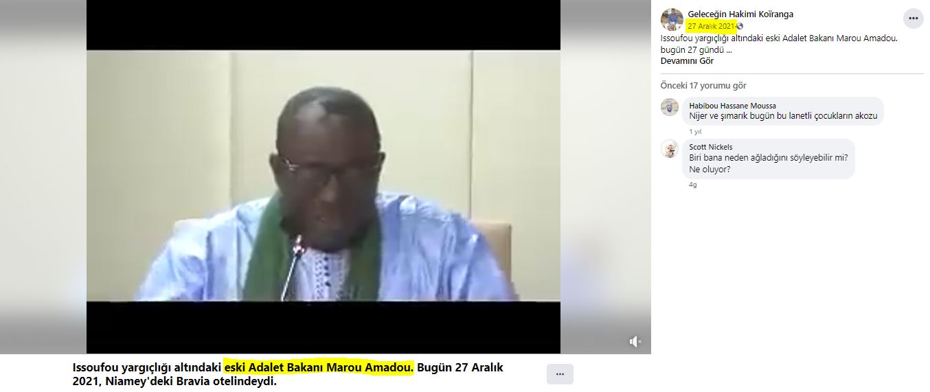 Videoda ağlayan kişiye dair araştırma yapmaya devam ettiğimizde ise, 27 Aralık 2021’de Facebook’ta bir paylaşım yapıldığı anlaşılıyor. Videonun açıklamasında, görüntüdeki kişinin eski Adalet Bakanı Marou Amadou olduğu bilgisine yer verilmiş. Amadou, 2011- 2021 yılları arasında Nijer’de Adalet Bakanı olarak görev yapmış.