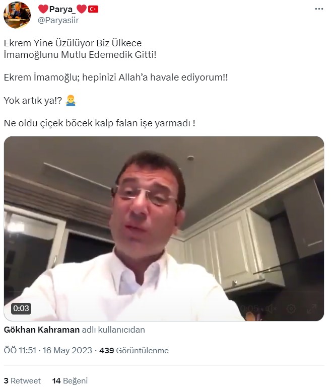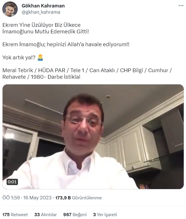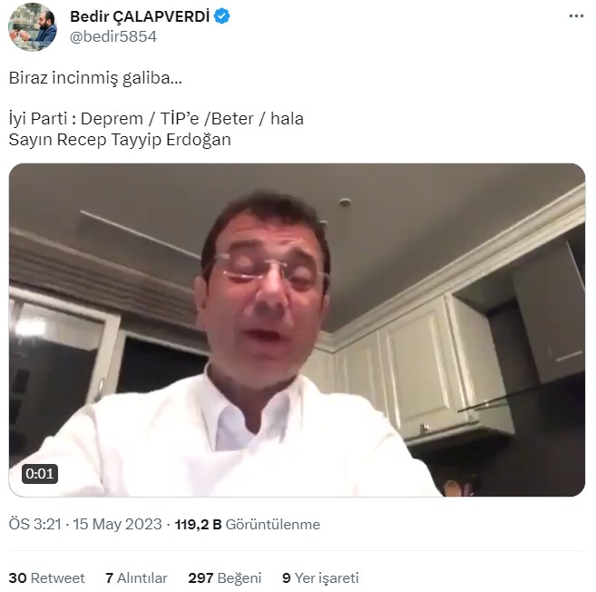 Orijinal versiyonunda 49 saniye olduğunu gördüğümüz videonun, 5 saniyelik kısmının kırpıldığı anlaşılıyor. Kırpılmış video, İmamoğlu’nun 14 Mayıs seçiminden sonra tepkisini gösterdiği şekilde algılanmış.