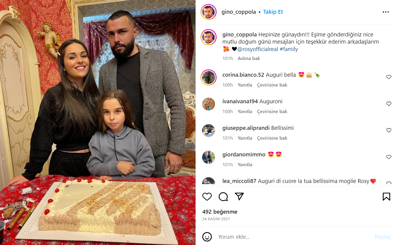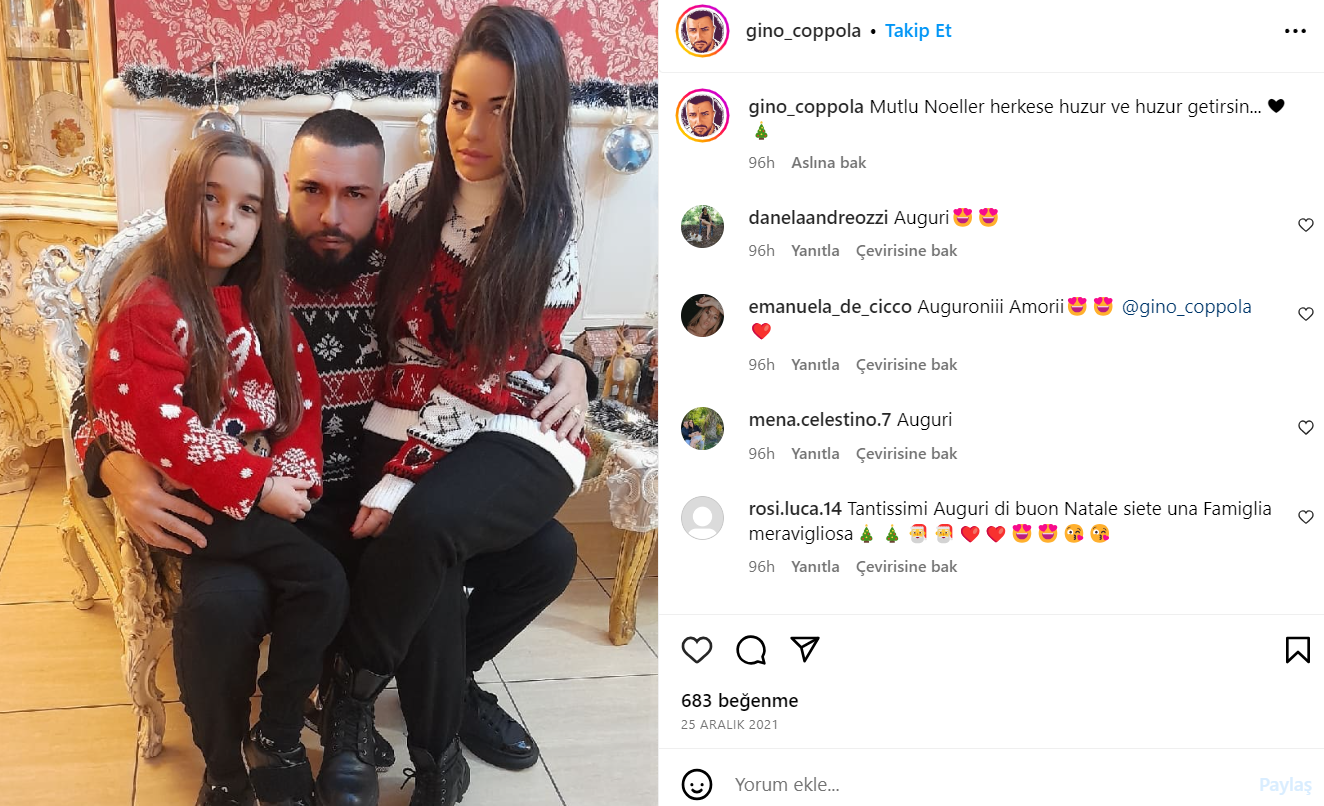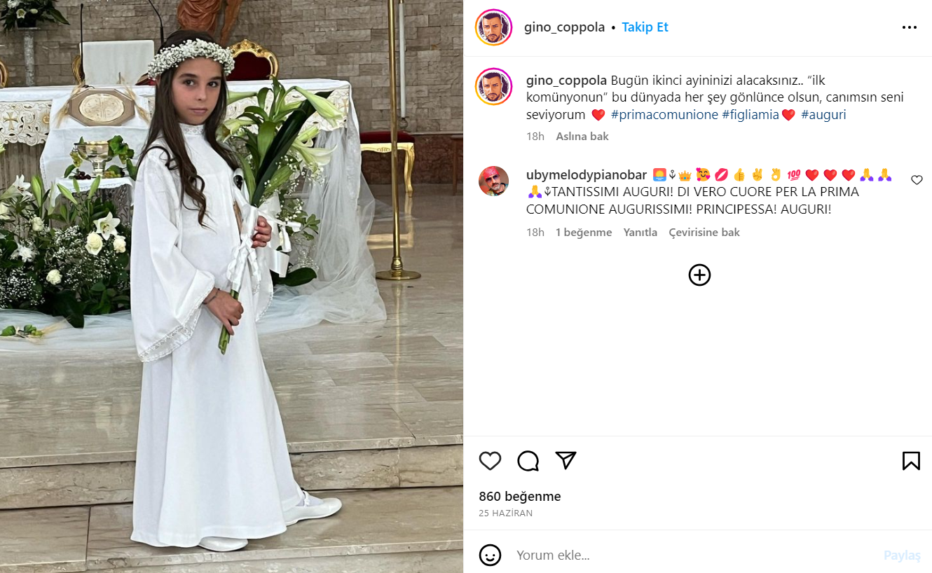 Hesabın profilini incelediğimizde kızı ve eşiyle farklı fotoğraflarının olduğunu gördük.  Son paylaştığı gönderilerden birinde benzer kıyafetlerle poz verdikleri görülüyor. Gino Coppola, açıklama kısmında kızının Komünyon gününde prenses olmak istediğini yazmış.