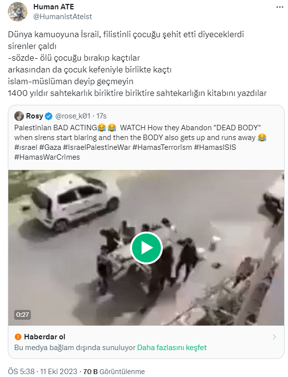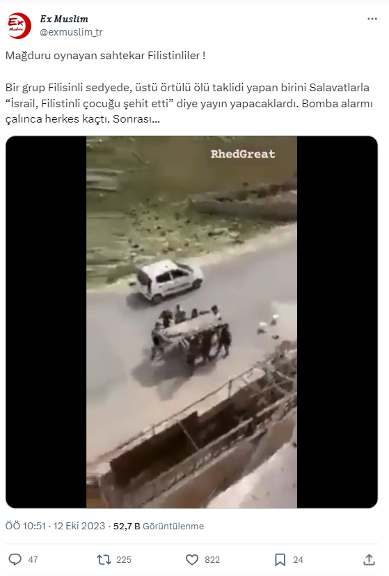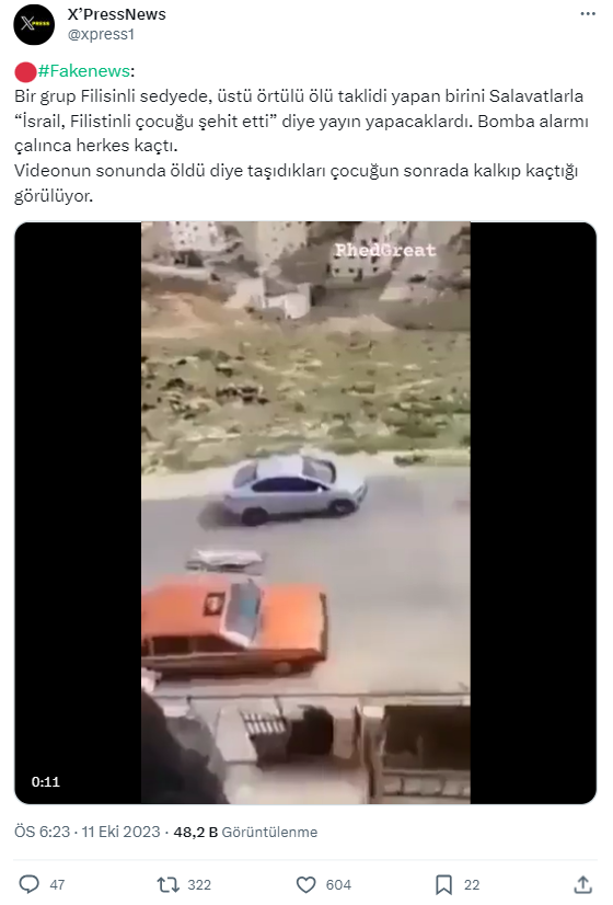 Filistin-İsrail arasındaki çatışmanın devam ettiği şu günlerde iki taraf hakkında da farklı iddialar dolaşımda. Bugün inceleyeceğimiz video, açıklama kısmında Filistinlilerin sahte cenaze töreni düzenleyerek kamuoyunu yanıltmaya çalıştığı iddiasıyla paylaşılıyor.