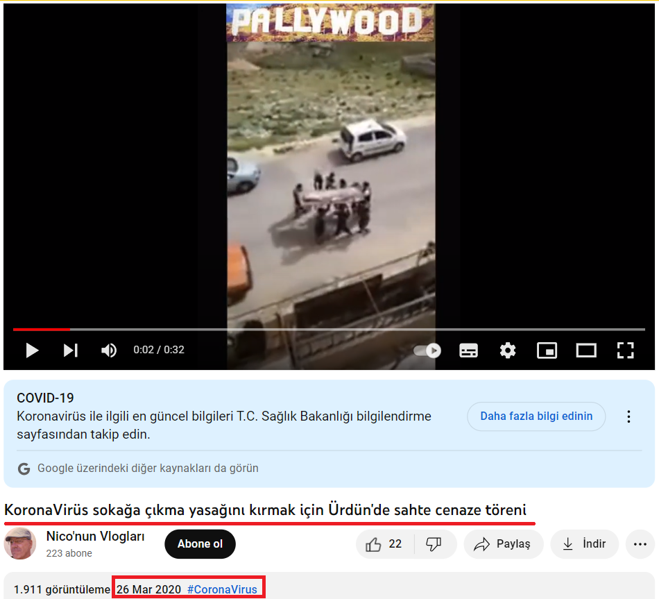 Videonun internet geçmişini aramaya başladığımızda karşımıza bir YouTube videosu çıktı. Video 2020 yılında paylaşılmış ve başlık olarak “fake funeral in Jordan, to break the CoronaVirus curfew” yani “Ürdün’de korona sokağa çıkma yasağını delmek için sahte cenaze töreni” kullanılmış.