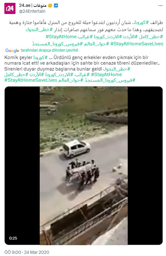 2,5 milyon takipçisi bulunan haber kuruluşu Orient’in yayınında da sokağa çıkma yasağını delmek için düzenlenen sahte cenazesi töreni videosunun viral oluşundan bahsedilmiş.