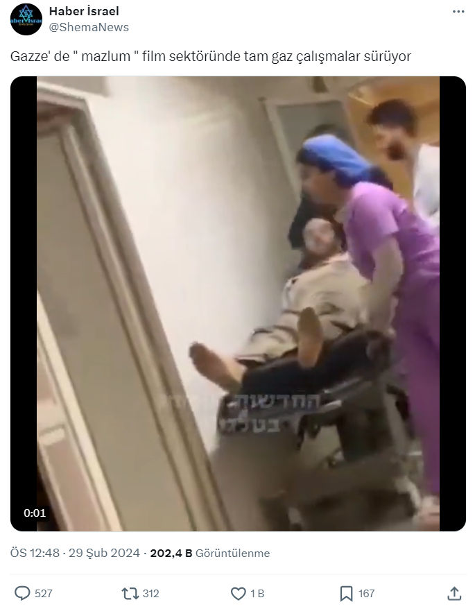 Haber Israel isimli X hesabı, “Gazze’ de ” mazlum ” film sektöründe tam gaz çalışmalar sürüyor” açıklamasıyla birlikte paylaştı ve gönderisi 200 binden fazla görüntülendi.