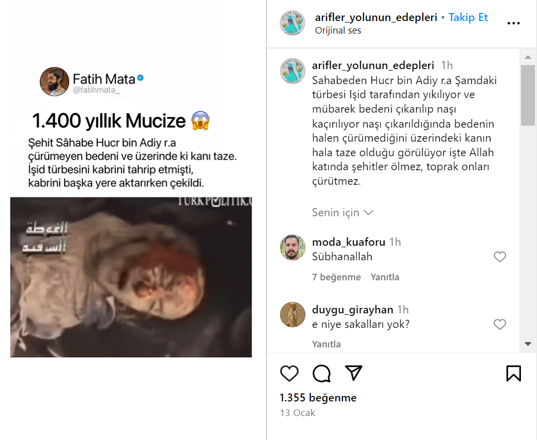 Paylaşımın açıklama kısmına vefatının üstünden yüzyıllarca yıl geçmiş olmasına rağmen bedeninin çürümediği ve üzerindeki kanın taze olduğu yazılmış.