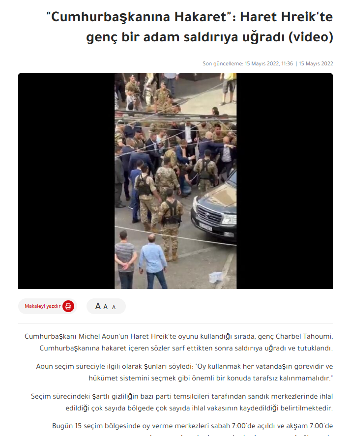 O dönemde yapılan seçimler sırasında, Cumhurbaşkanı Michel Aoun oy kullanmak için Haret Hreik bölgesine geldiği sırada, Charbel Tahoumi adlı bir genç tarafından sözlü hakarete maruz kalmıştı. Söz konusu video da bu olayın hemen ardından Tahoumi’nin güvenlik güçleri tarafından darp edilerek gözaltına alındığı anları gösteriyor.