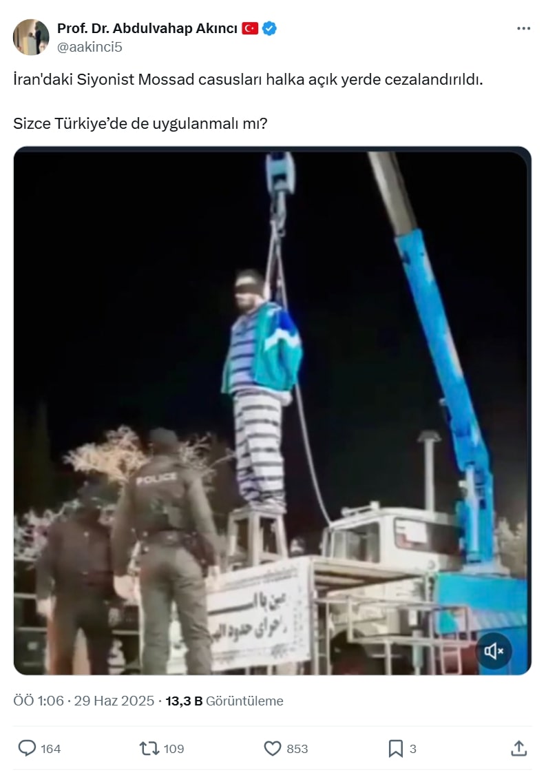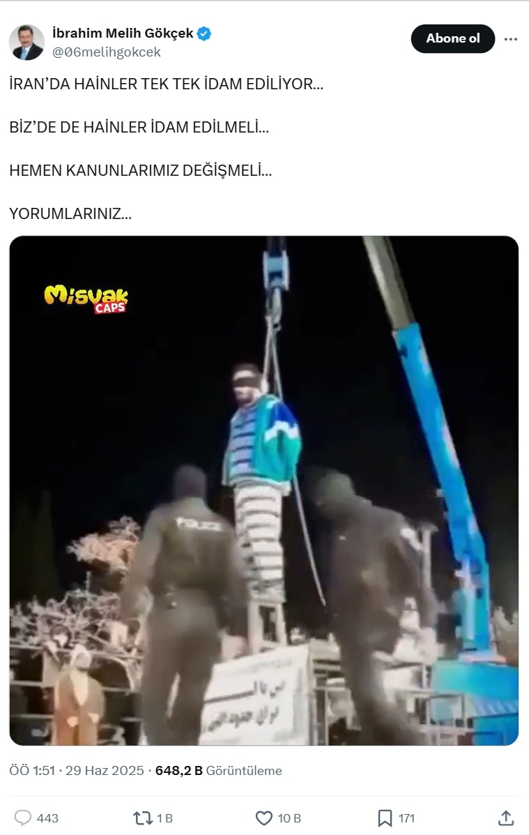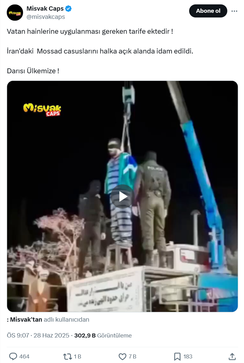 İki ülke arasındaki gerilim bu şekilde devam ederken sosyal medyada İran’da halka açık şekilde infaz edilen MOSSAD ajanlarını gösterdiği iddiasıyla bir video dolaşıma sokuldu.