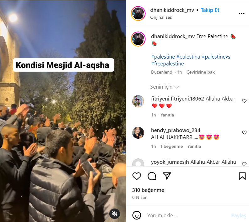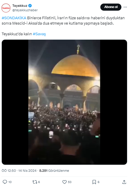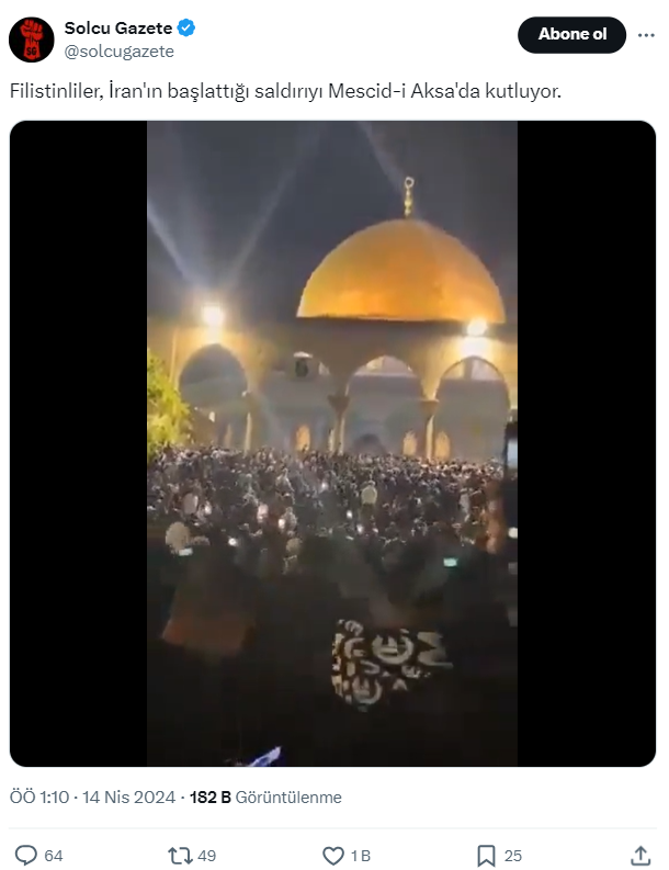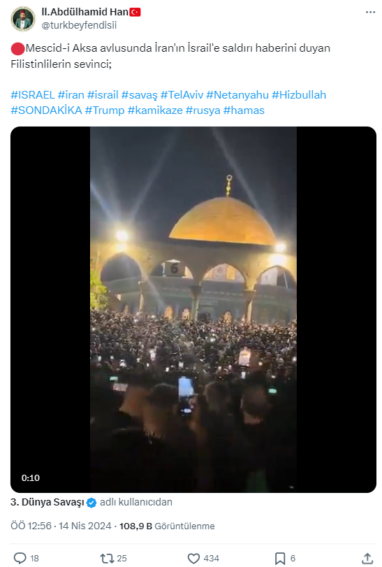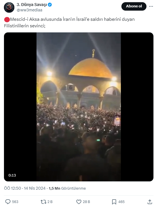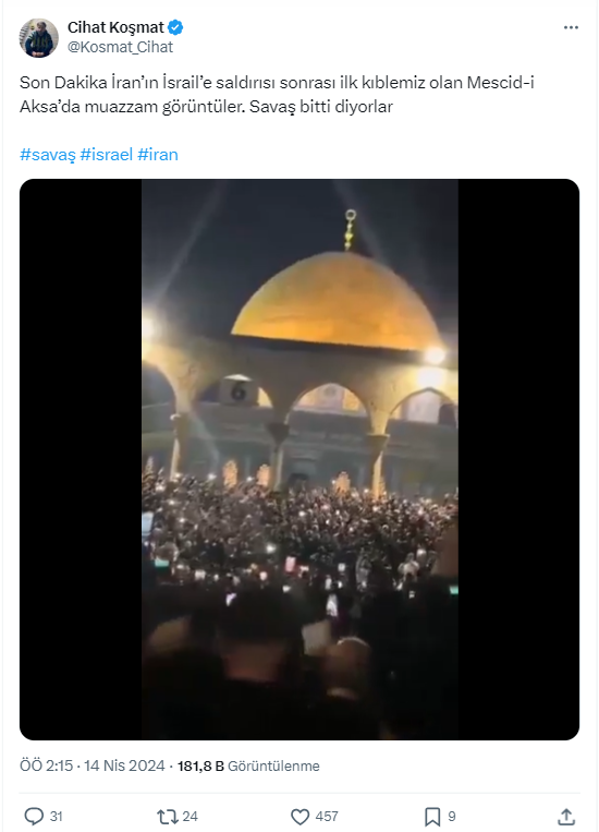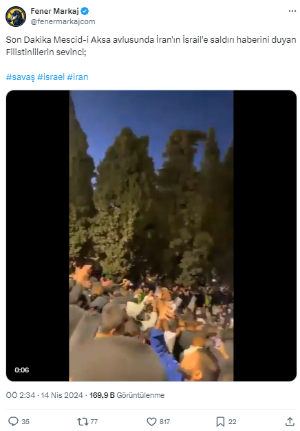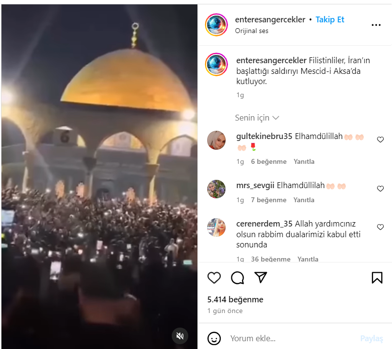 Saldırı haberlerine yönelik paylaşımlar sürerken, 13 Nisan’da paylaşılan bir videonun Mescid-i Aksa’da toplanan kalabalığın İran’ın İsrail’e saldırısını kutlayan Filistinlileri gösterdiği iddia edildi.