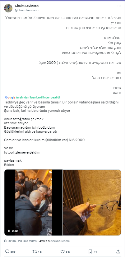 Videodan ekran görüntüsü alarak internetteki geçmişini sorgulamaya başladık. Karşımıza Gazeteci Haim Levinson‘un X’teki paylaşımı çıktı. İsrailli gazeteci, paylaşımına iddia videosu olarak incelediğimiz görüntüyü ve kırılan gözlüğünün fotoğrafını eklemiş. Açıklamasında ise maç çıkışında polis ve vatandaş arasında çıkan şiddet olaylarından bahsettiğini gördük.