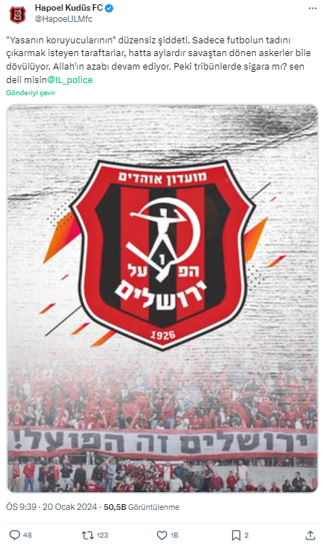Ev sahibi takım Hapoel Jerusalem de oyunun ilk yarısında polisin taraftar tribünlerine girdiğini, sebep olaraksa sigara yakıldığının gösterildiğini belirtti.