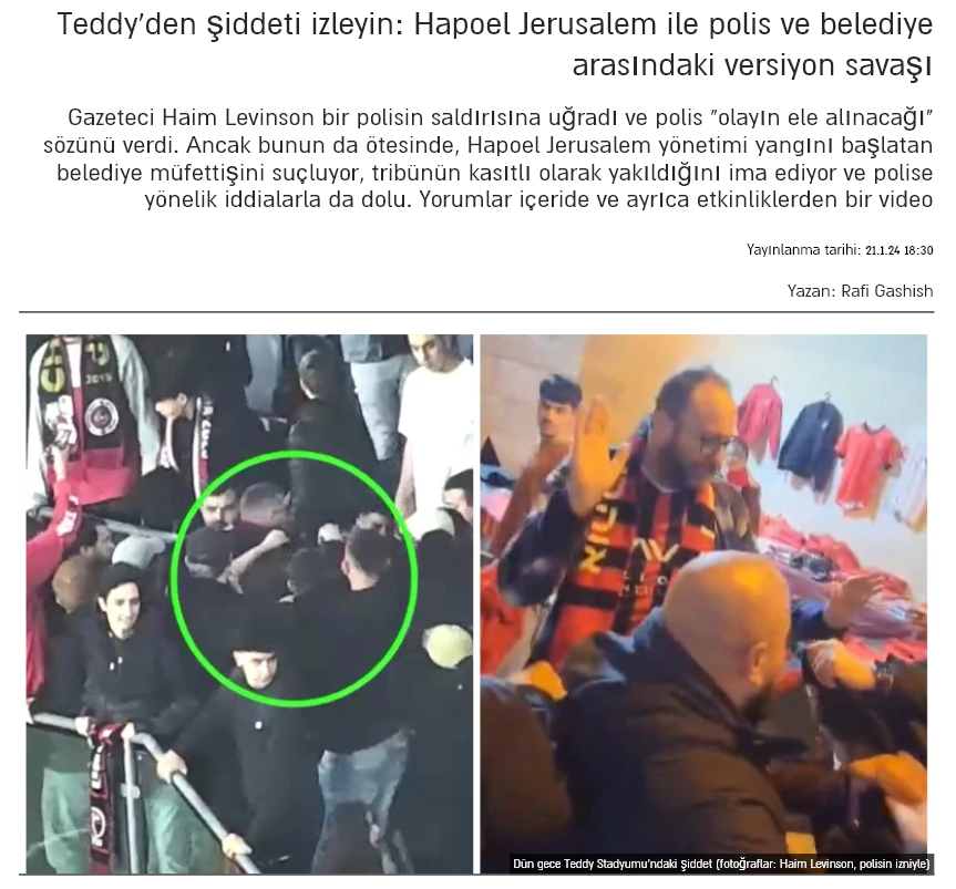 Anahtar kelime aramasıyla konuyla ilgili haberlere ulaştık. Sport1‘in haberine göre Hapoel Jerusalem ile Hapoel Beer Sheva arasında 20 Ocak’ta Teddy Stadyumunda oynanan maçın ardından pek çok Hapoel Jerusalem taraftarı, kendilerine yönelik polis şiddetinden şikayetçi oldu. Şikayetçilerden birisi de yukarıda da andığımız Gazeteci Haim Levinson.