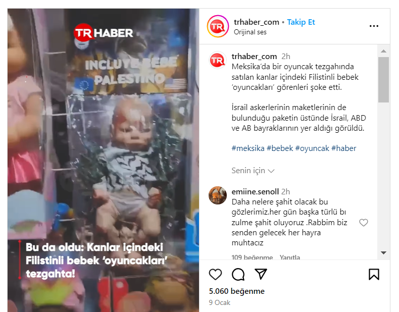 Sonuç olarak tasarlanan yaralı oyuncak bebek, Meksikalı bir sanatçı tarafından Filistin’de yaşanan olaylara dikkat çekmek ve Filistin halkına destek olmak amacıyla üretilmiş ve tasarlanan oyuncak bebeğin satışta olmadığı farkındalık yaratmak maksadıyla bir tane üretildiği anlaşılıyor.